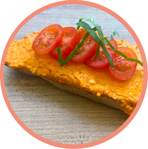 mehr Infos zum ProduktGlutenfreiNEUVeganPaprikaMuhammaraStyle GF | 1010 Stück | glutenfreies Brot (Fritz Mühlenbäckerei) | gegrillte Paprika, Walnuss, Kreuzkümmel, Sonnenblumenkerne, Gurke, Trockentomate, Kresse 10 pieces | gluten-free bread (Fritz Mühlenbäckerei)| grilled peppers, walnuts, cumin, sunflower seeds, cucumber, dried tomatoes, cress