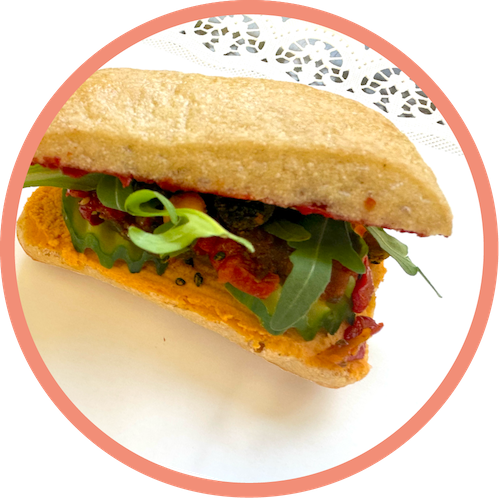 - Antipasti-Ciabatta: Tomatencreme, Humus, Antipasti (Paprika, Zucchini, Aubergine), Gurke, schwarzer Sesam | vegan