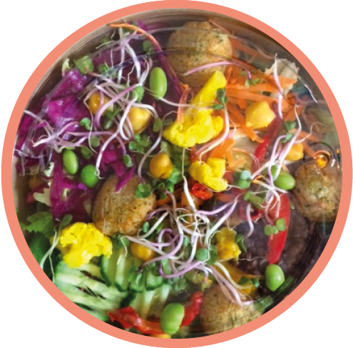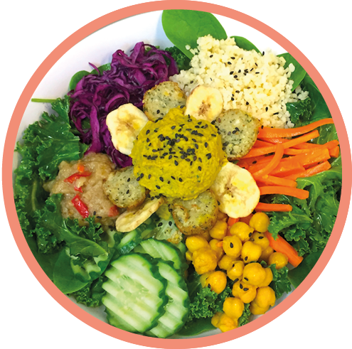 mehr Infos zum ProduktGlutenfreiLaktosefreiVeganWüstenblume Bowl1 Bowl | Tahini-Orangen Dressing | Blattsalatbett, Quinoa, Antipasti hausgemacht, Kichererbsen-Kurkuma, Blaukraut mariniert, Karotten, Gurken, Bananenchips, schwarzer Sesam, Humus, Falafel 1 Bowl | Tahini-Orange Dressing | Leaf salad, quinoa, Antipasti homemade, chickpea and turmeric, marinated red cabbage, carrots, cucumbers, banana chips, black sesame seeds, hummus, falafel