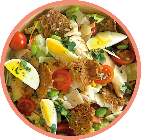mehr Infos zum ProduktCaesar Salat1 Salatbowl | Caesar Dressing | 1 Gebäck/Brot (je nach Verfügbarkeit) Hühnchen-Flakes mit Parmesankruste, Ei, Cocktailtomaten, Gurken, Mais, Paprika, Parmesan, Brotchips, Kräuter, Limette