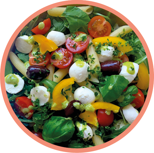 mehr Infos zum ProduktVegetarischDolce Vita Salat1 Stück | Balsamico Dressing | 1 Gebäck/Brot (je nach Verfügbarkeit) Penne, Mozzarella, Cocktailtomaten, Oliven, Paprika, Basilikum