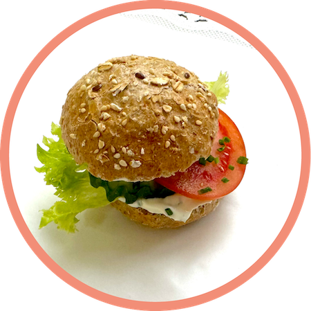 - Frischkäse-Vollkörndl: Kräuterfrischkäse, Gurke, Tomate, Kresse