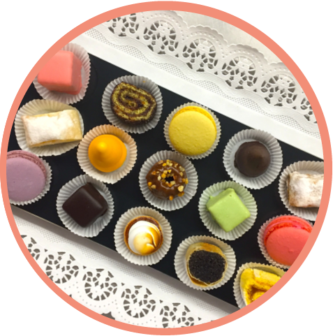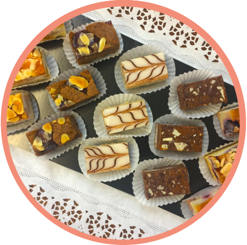 mehr Infos zum ProduktNaschkatzerl | 1515 Stück | Topfenstrudel, Pariser Spitz, Mozart Würfel, Annaschnitte, Lemontörtchen 15 pieces | Cheese strudel, Parisian tips, Mozart cubes, Anna slice, Lemon tart
