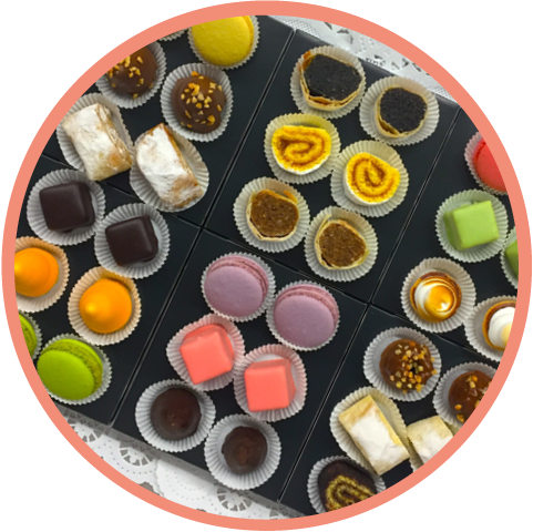 mehr Infos zum ProduktTwinni | 1515 Stück | Buttermarillenfleck, Pistazien Makronen, Passionfrucht Spitz, Mozart Würfel, Biskuitroulade 15 pieces | Butter apricot cake, pistachio macaroons, passion fruit tips, Mozart cubes, sponge roll with apricot jam