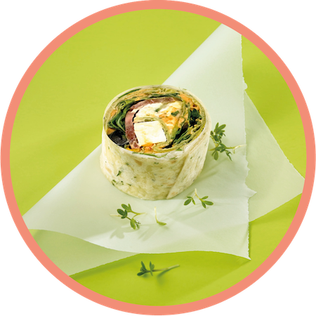 - A Arabia Wrapini®: Oriental cream cheese, antipasti (peppers, zucchini, eggplant), feta cheese, black sesame seeds, paprika