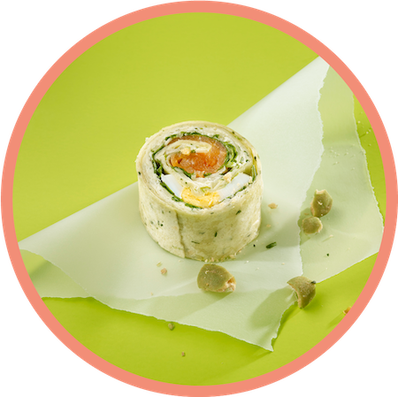 mehr Infos zum ProduktA Lachs Wrapini® | 1515 Stück | sortenrein | Wrap-Fladen (Weizentortilla) | W®-Salatmischung mit Ruccola Merrettichaufstrich, Räucherlachs, Ei, Karotten, Paprika