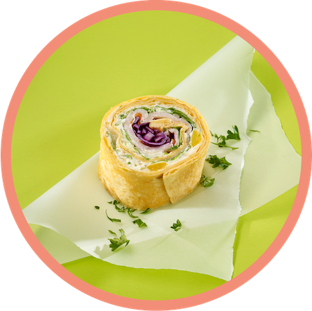 mehr Infos zum ProduktNEUA Sweet Turkey Wrapini® | 1515 Stück | sortenrein | Wrap-Fladen (Weizentortilla) | W®-Salatmischung mit Ruccola, Aprikosen-Rosmarin Frischkäse, Putenbrust geräuchert, Ei, Krautsalat, Paprika